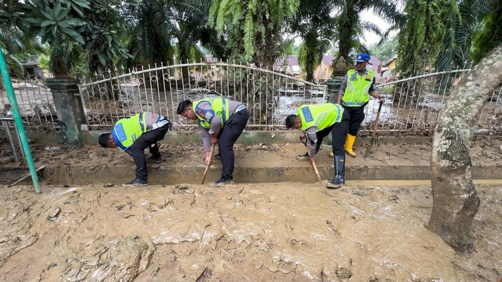 Selain menyalurkan sembako, Tim Kemanusiaan Korlantas Polri juga turun tangan membantu penanganan bencana banjir secara fisik. Mereka kompak membersihkan salah satu masjid di Aceh Tamiang yang ikut terdampak akibat banjir bandang.